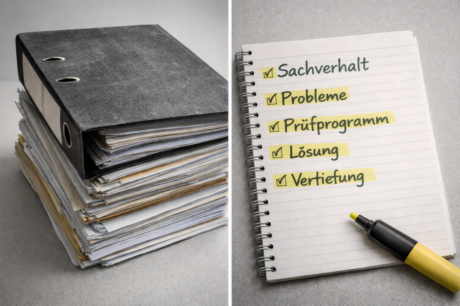 Und das Examen fragt dich nicht deine Karteikarten ab. Es prüft Anwendung.